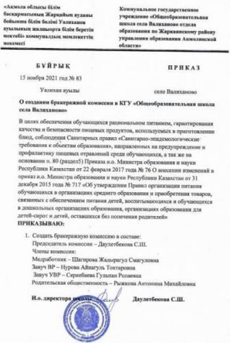 Приказ о создании бракеражной комиссии в ГУ "Валихановская СШ".